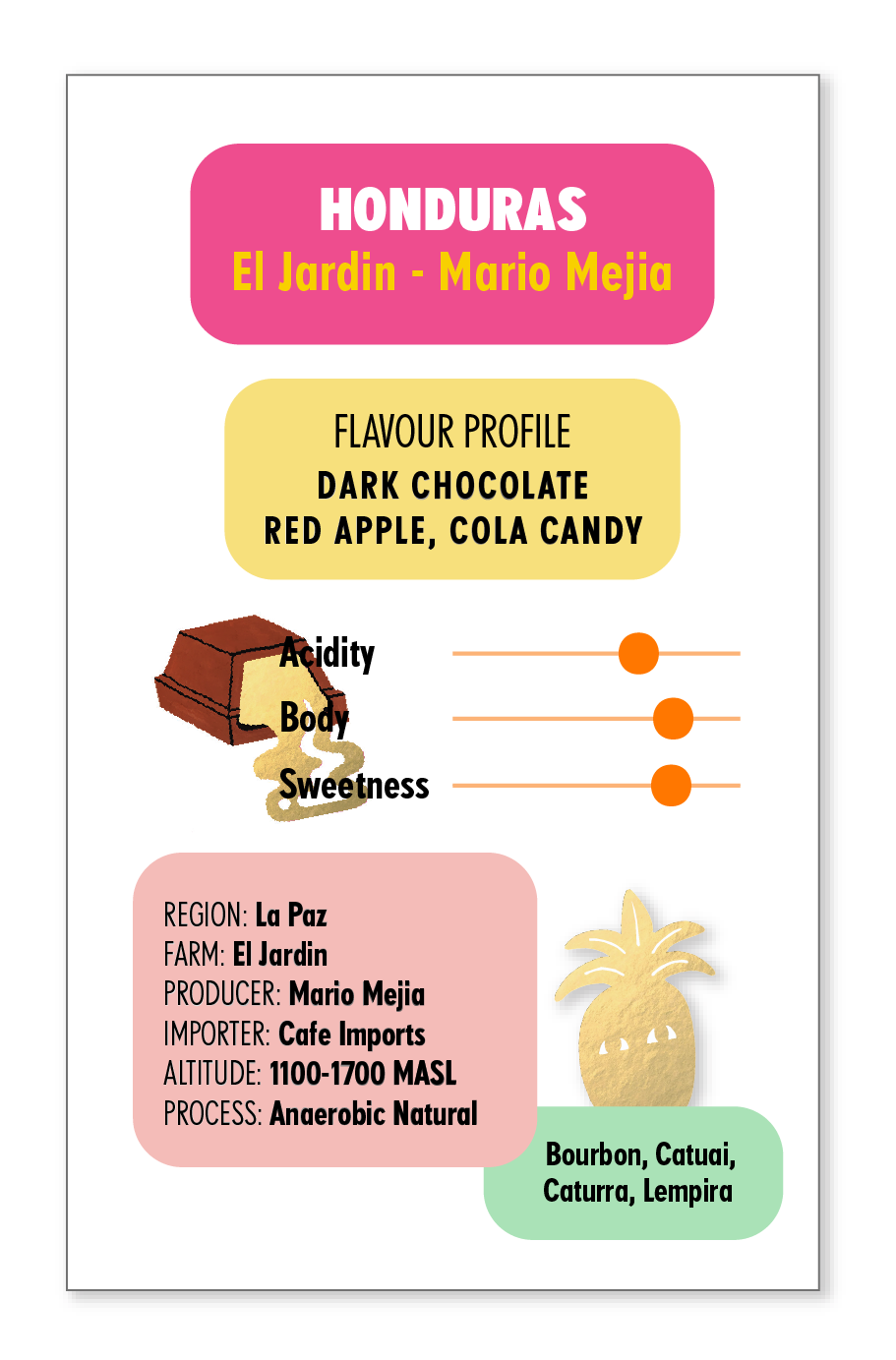 As an espresso, this coffee delivers a rich, full-bodied cup with a lingering, satisfying finish. Its sweetness and depth reveal notes of dark chocolate and cola candy, creating a smooth and indulgent experience. Brewed as a filter, the cup shows excellent clarity and balance, highlighting layers of crisp apple, subtle spice, and a refined sweetness that reflects the careful processing at Finca El Jardín.