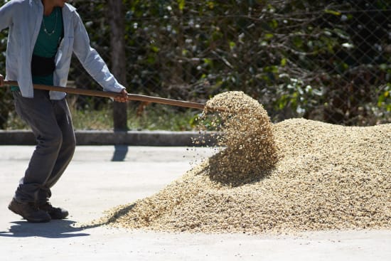 The coffee is processed using the washed method: ripe cherries are picked and depulped the same day, fermented for 12–24 hours in open-air tanks, then washed and dried on patios or raised beds for around 15 days.