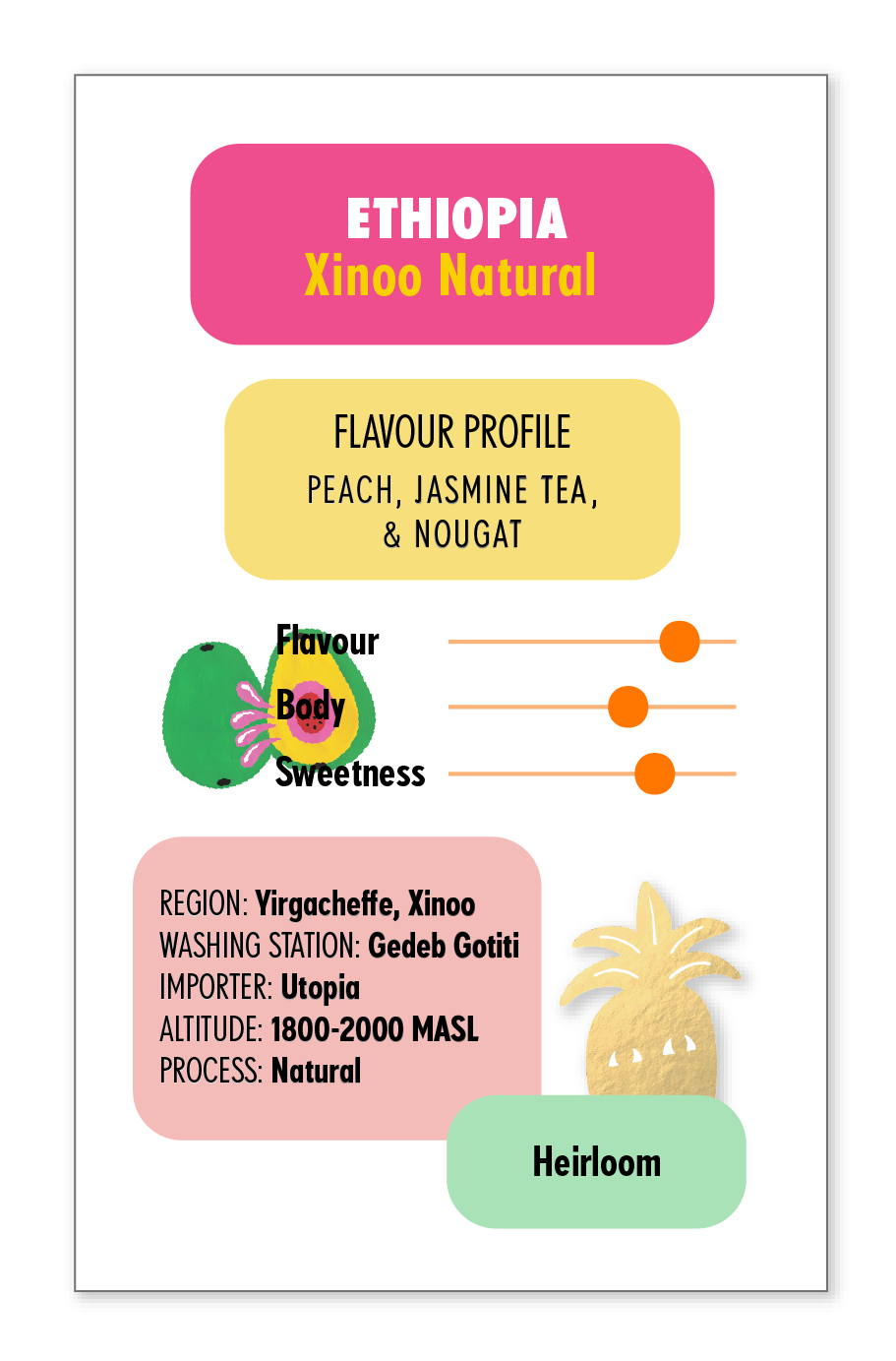 We’re excited to share the tasting notes for our Ethiopia Yirgacheffe Xinoo. This coffee opens with a wonderfully fragrant aroma reminiscent of fresh peach. On the palate, expect sweet nougat complemented by delicate floral notes of jasmine tea. These expressive characteristics are the result of natural processing, allowing the coffee’s inherent fruit flavours to shine through. We hope you enjoy every cup.